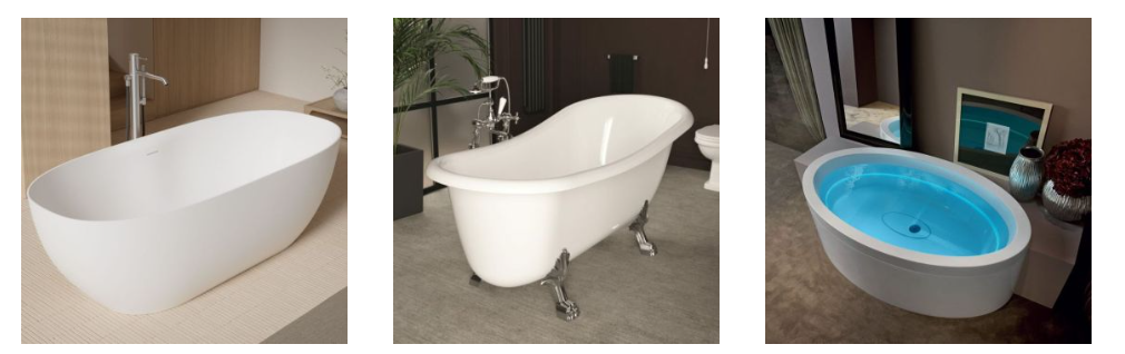 Окремо стоячі ванни представлені у широкому діапазоні стилів — від класичних моделей на левових лапах (стиль вікторіанської епохи) до сучасних, мінімалістичних та асиметричних чаш.